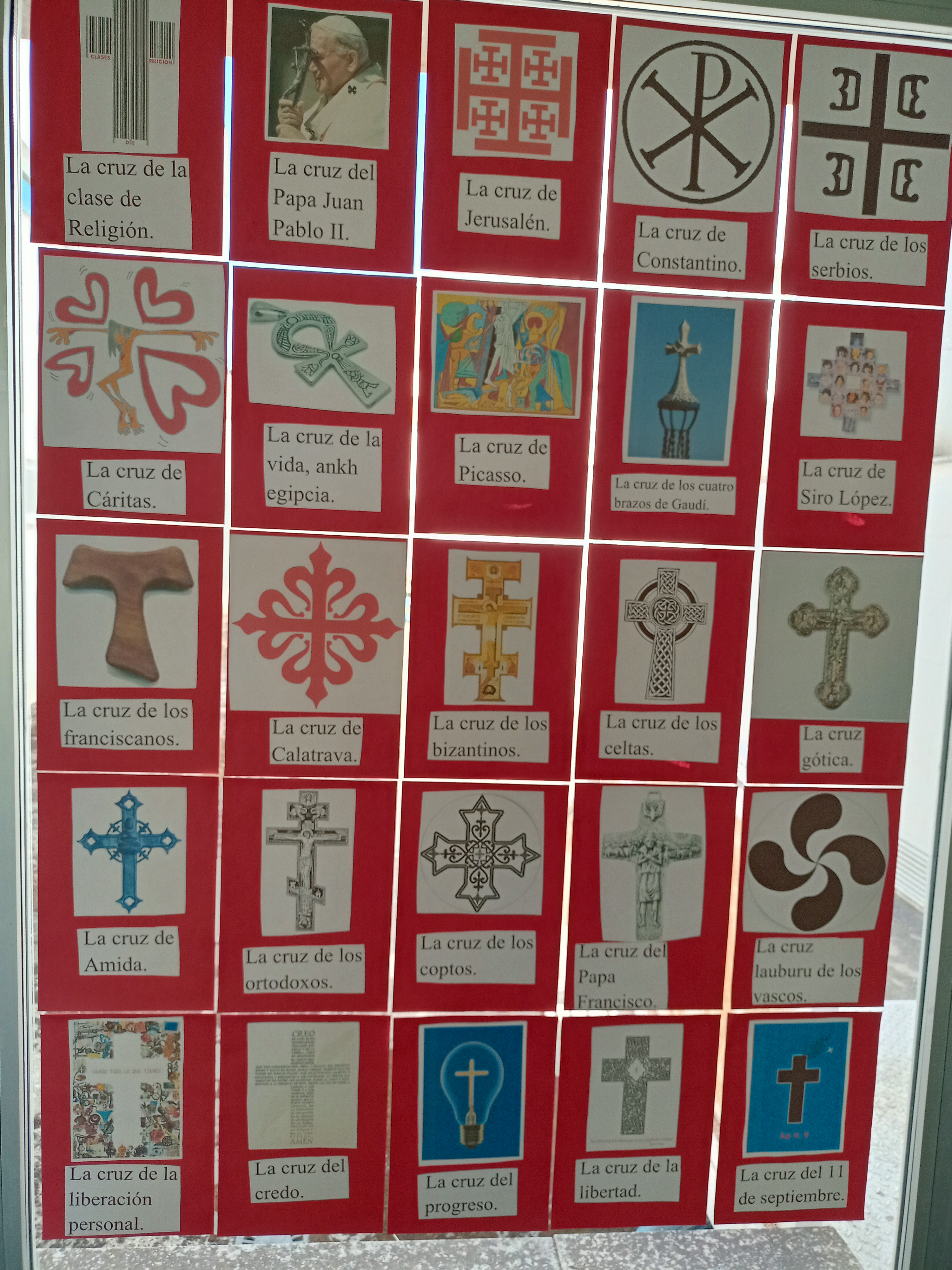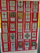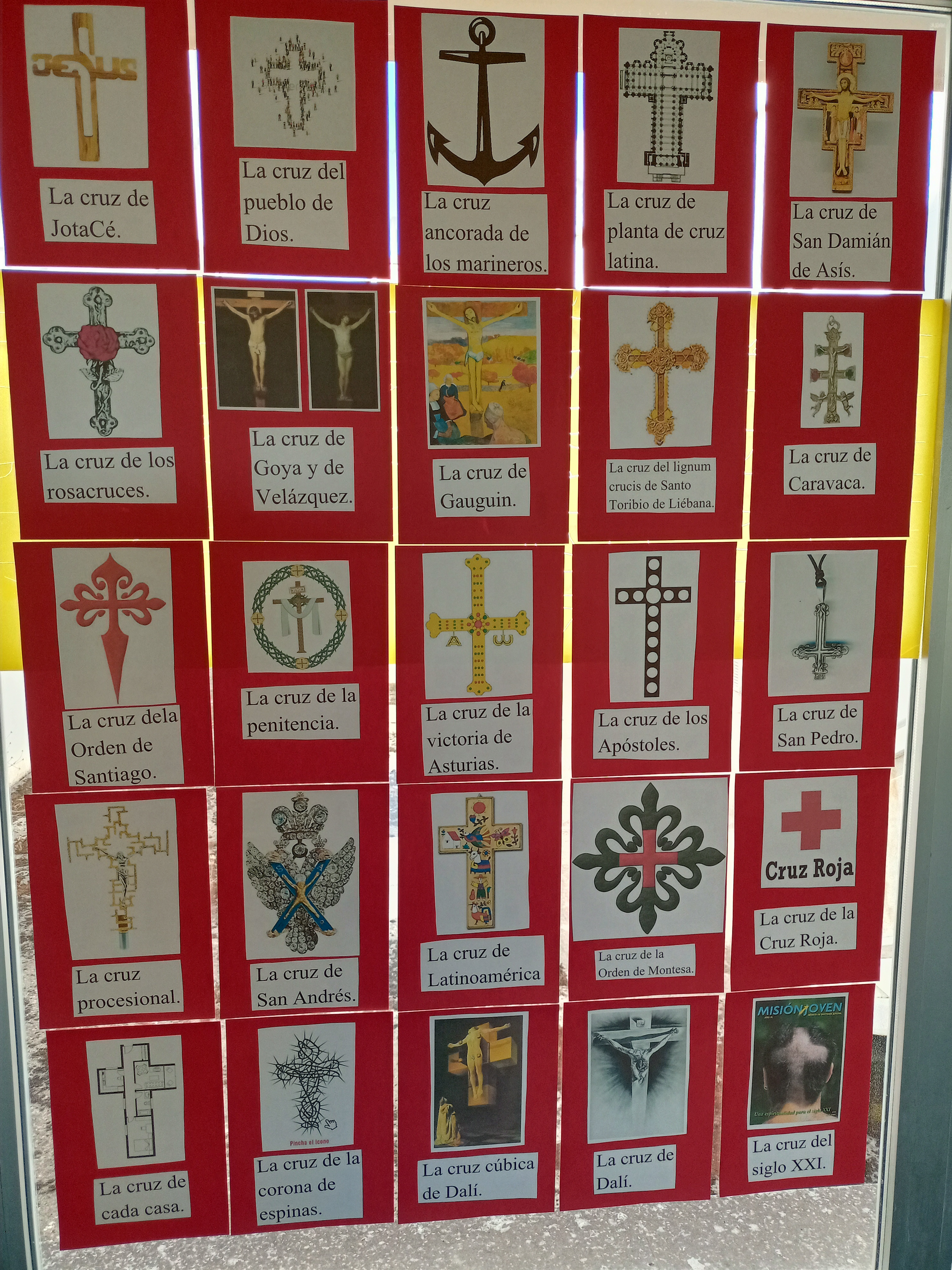 El Departamento de Religión ha organizado la exposición “Las 50 cruces más significativas de la historia” en los pasillos del centro. Se pueden observar cruces relacionadas con el cristianismo, la mayoría, pero también de épocas y civilizaciones anteriores (egipcios, vascones, celtas…), así como otras de carácter artístico (Gaudí, Dalí, Picasso, Goya, Velázquez, Gauguin…), muchas de tipo social y humanista y algunas de uso más personal (Juan Pablo II, Francisco…).